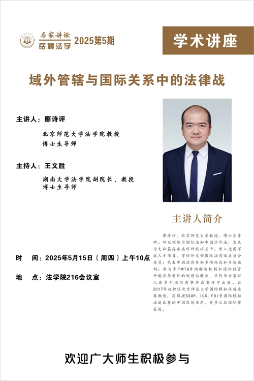 “岳麓法学名家讲坛”,以“域外管辖与国际关系中的法律战”为主题,结合美国法和中国法之间的异同来进行分析,深入解析了当代国际法背景下的域外管辖与国际关系之间的法律事务现状及其内在逻辑。讲座由91吃瓜