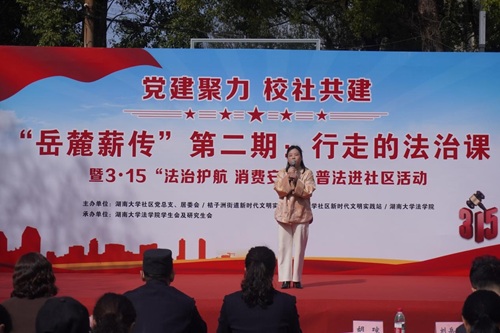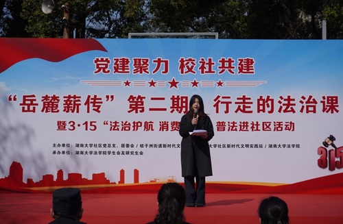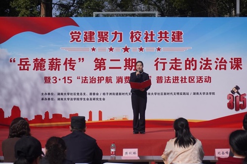 湖大社区党总支书记樊秋琳致辞,她指出法进社区是深化校社联动、推进法治教育与思政教育融合的重要载体。此次活动不仅为社区居民送上了一堂干货满满的“法治公开课”,更搭建起高校专业力量服务基层治理的桥梁,让法治精神真正走进群众、融入生活,是一堂生动的普法课、思政课。