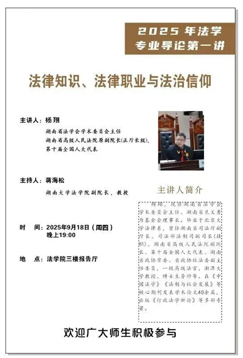 杨翔,现任湖南省法学会学术委员会主任、湖南省见义勇为基金会理事长。毕业于北京大学法律系,曾任湖南省司法厅副厅长、司法部法制司副司长(挂职)、湖南省高级人民法院副院长、第十届全国人大代表、湖南省政协常委、省政协社法委副主任委员,一级高级法官,湘潭大学教授、博士生导师等。在《中国法学》《法制与社会发展》等核心期刊发表学术论文40余篇,出版《行政法学新论》等多部专著。