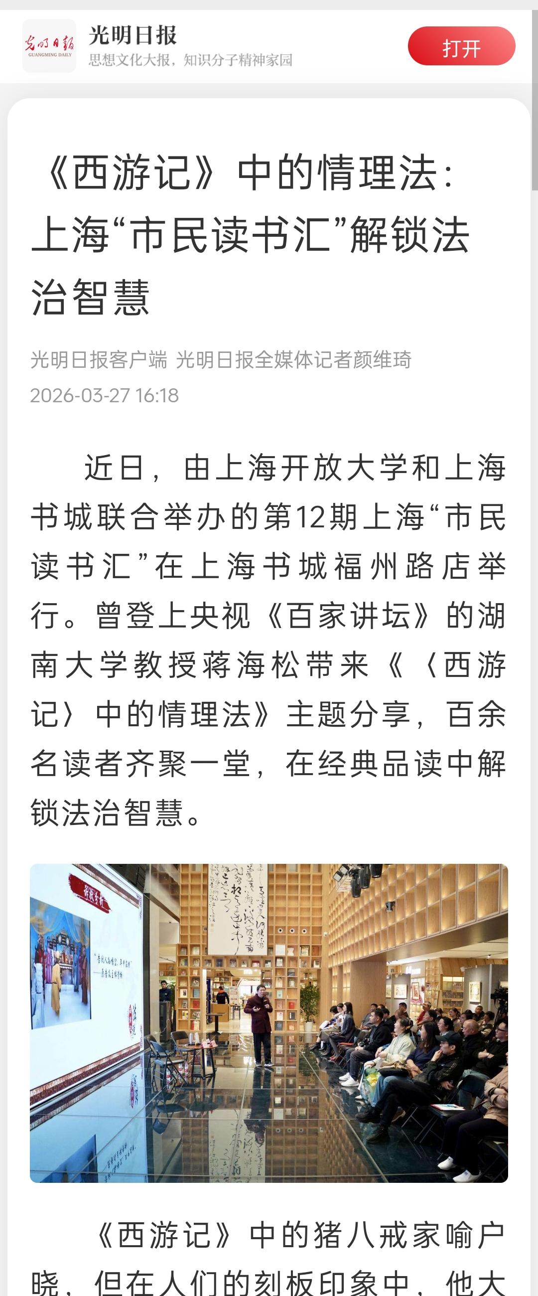 2026年3月22日下午,由上海开放大学和上海书城联合举办的第12期上海“市民读书汇”在上海书城福州路店举行。蒋海松教授带来《<西游记>中的情理法》主题分享。他用新颖的表达方式解锁法治智慧,引发现场掌声和笑声连连。