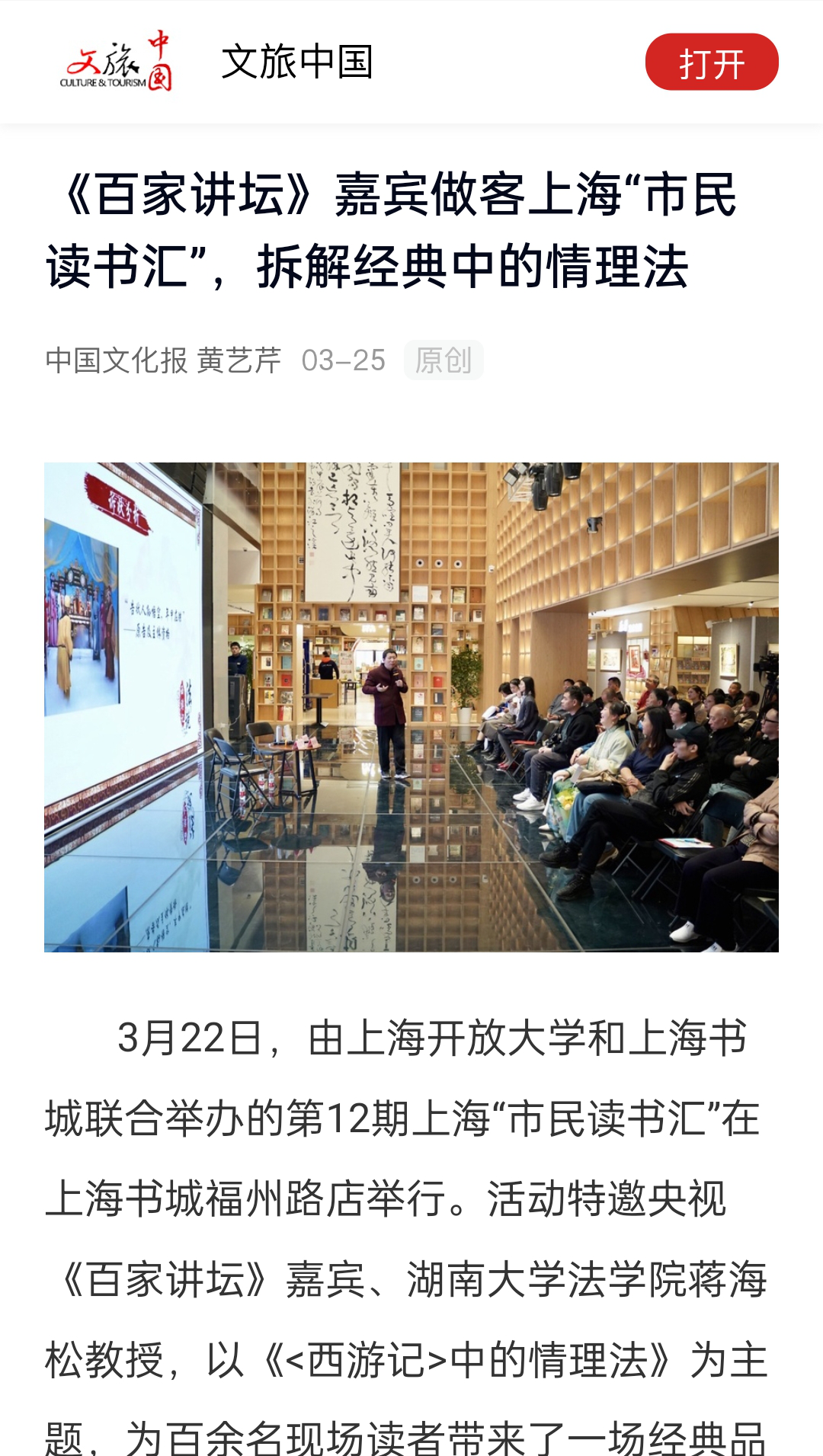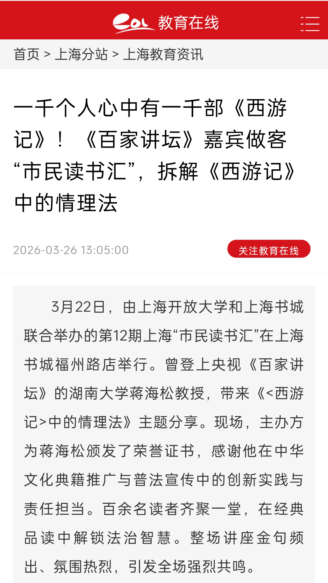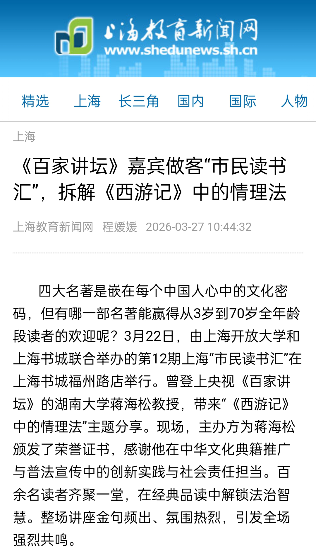 开展了三场讲座。这也是蒋老师新书《<西游记>中的情理法》上海分享会的系列活动。上海教育电视台、《光明日报》客户端、中国教育在线、《新闻晨报》、上观新闻、上海教育传媒网 、《中国文化报》、《光明教育家》、《上观新闻》、《教视新闻》等诸多媒体对讲座进行了密集报道。