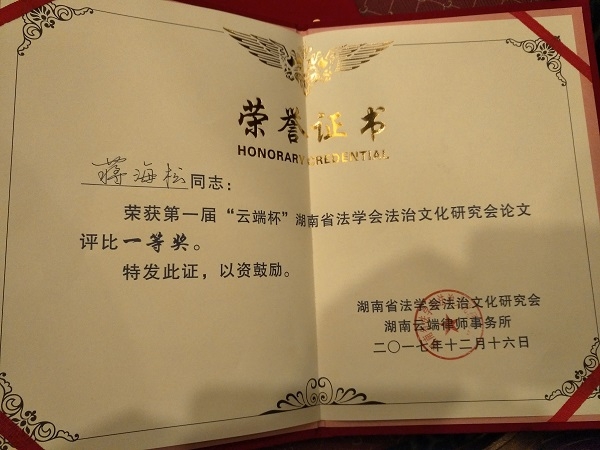 会议闭幕式上举行了湖南省法学会法治文化研究会首届征文颁奖仪式,根据专家评审,我院蒋海松副教授的论文《湖湘法治文化的历史传统与当代创新》荣获一等奖,我院助理教授李勤通论文《论秦汉司法文明的转型及其对我国司法改革的启示》,我院硕士生曹孝前论文《疑难案件裁判与道德衡量——基于中西方法律文化语境的比较研究》荣获优秀奖。