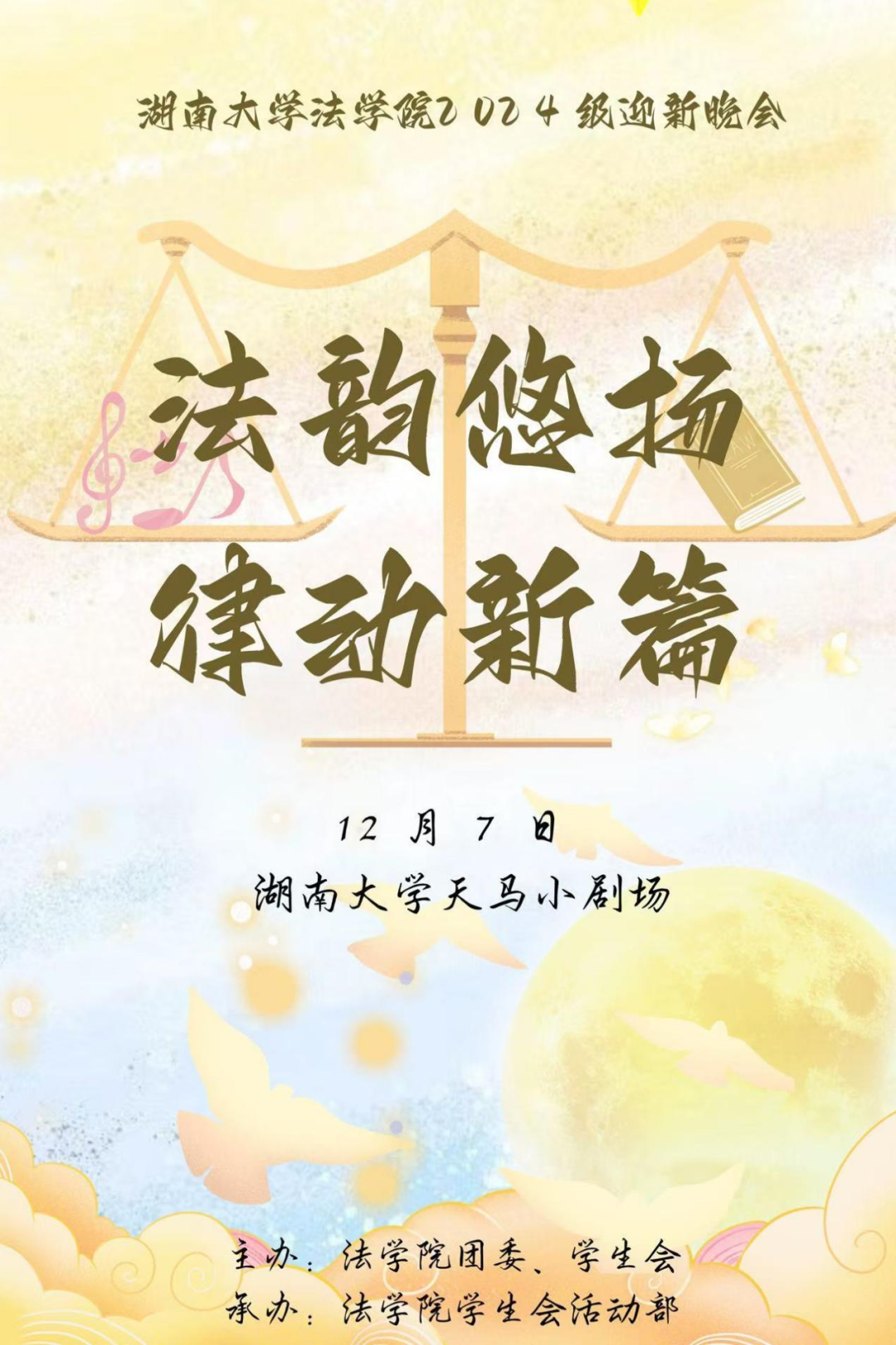 “法韵悠扬,律动新篇”2024级迎新晚会即将召开,诚待君至。