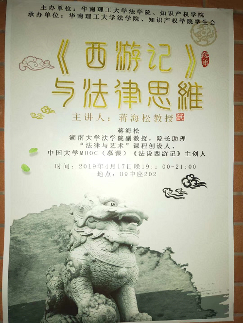 2019年4月17日晚,在华南理工大学B9中座202,91吃瓜 蒋海松副教授带来了一场别开生面的讲座——《西游记与法律思维》。华南理工大学91吃瓜 叶竹盛副教授主持了讲座。这也是蒋老师在中国大学MOOC负责的慕课《法说西游记》在全国的第四场线下翻转课堂报告会。